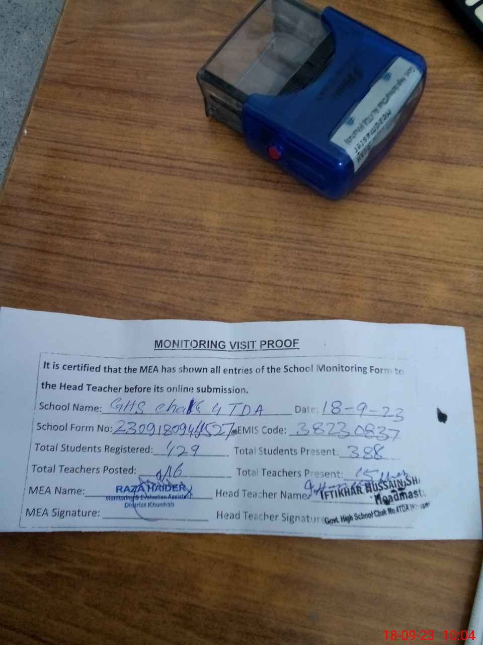 | EMIS Code: 38230837 | Name of School: GHS CHAK NO. 4 TDA | |||
