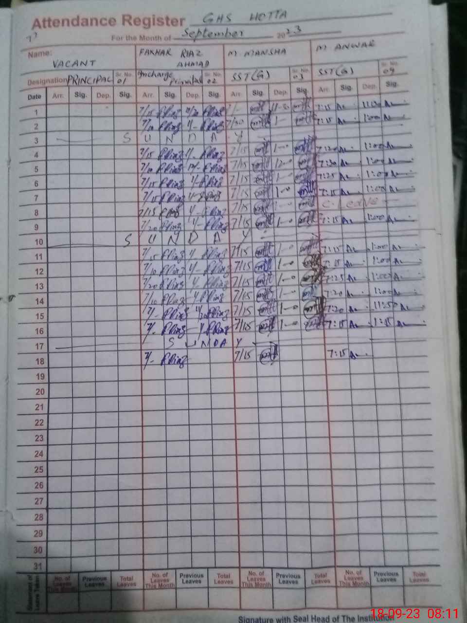 | Name: IJ**** AH**** Designation: (School Headmaster's/Headmistress's) SST SC (INCHARGE ) Phone/Cell Number: 03**** |