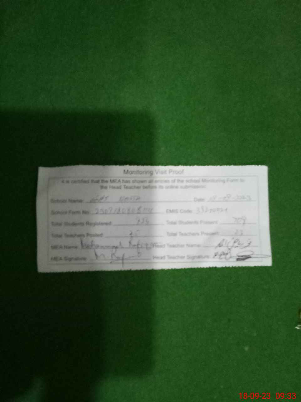| Attendance Register | Head Teacher | MEA with School | Visit Proof |
