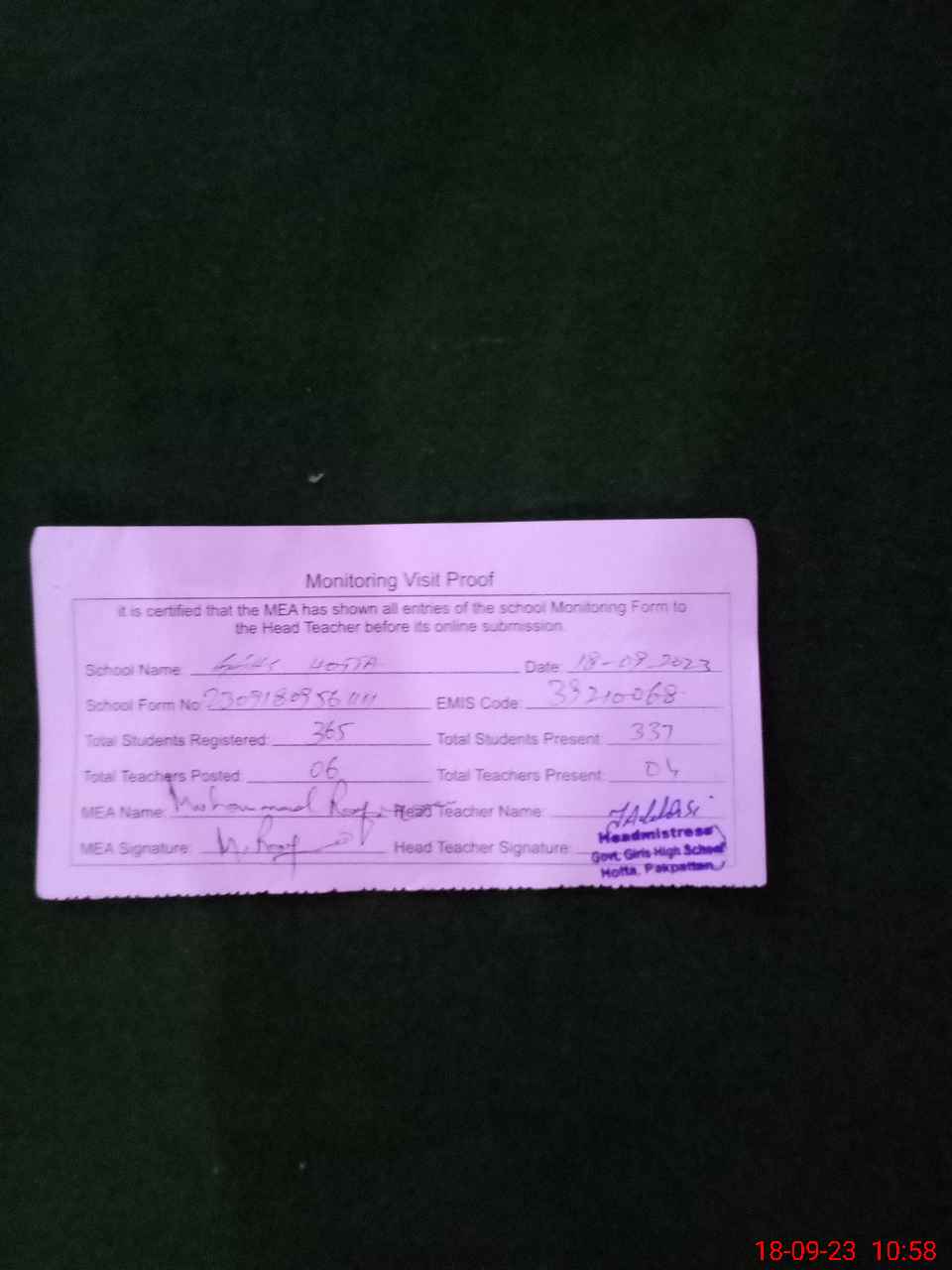 | Attendance Register | Head Teacher | MEA with School | Visit Proof |