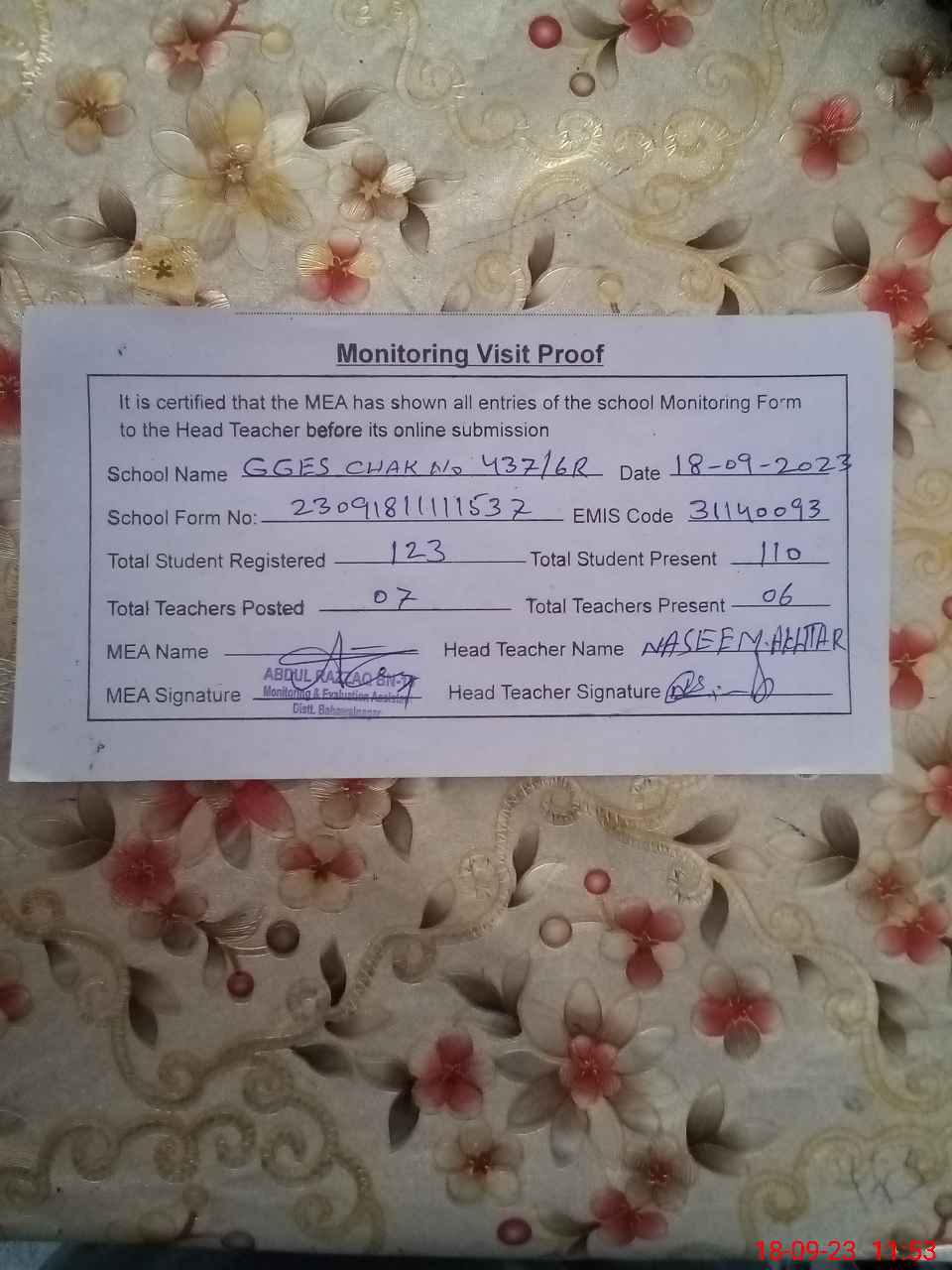 | Attendance Register | Head Teacher | MEA with School | Visit Proof |