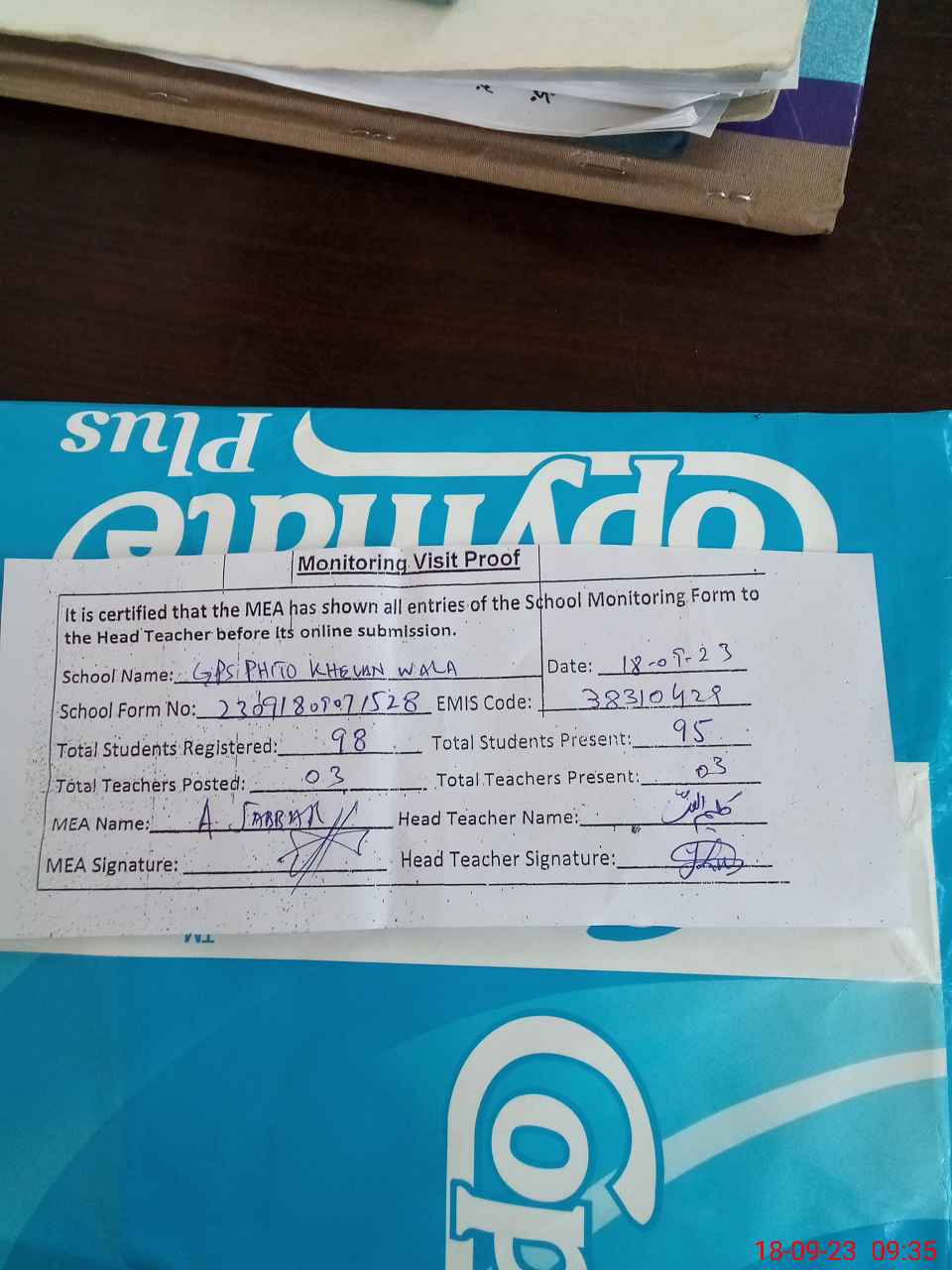 | Attendance Register | Head Teacher | MEA with School | Visit Proof |