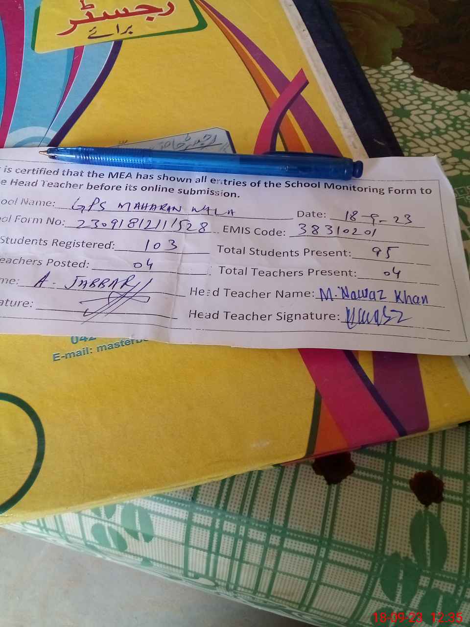| Attendance Register | Head Teacher | MEA with School | Visit Proof |