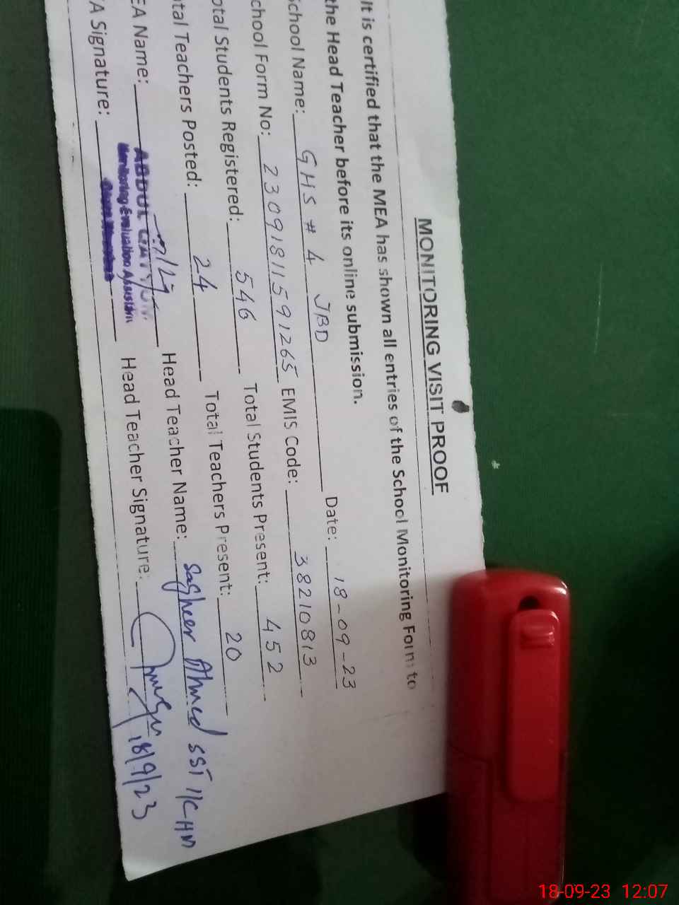 | Attendance Register | Head Teacher | MEA with School | Visit Proof |