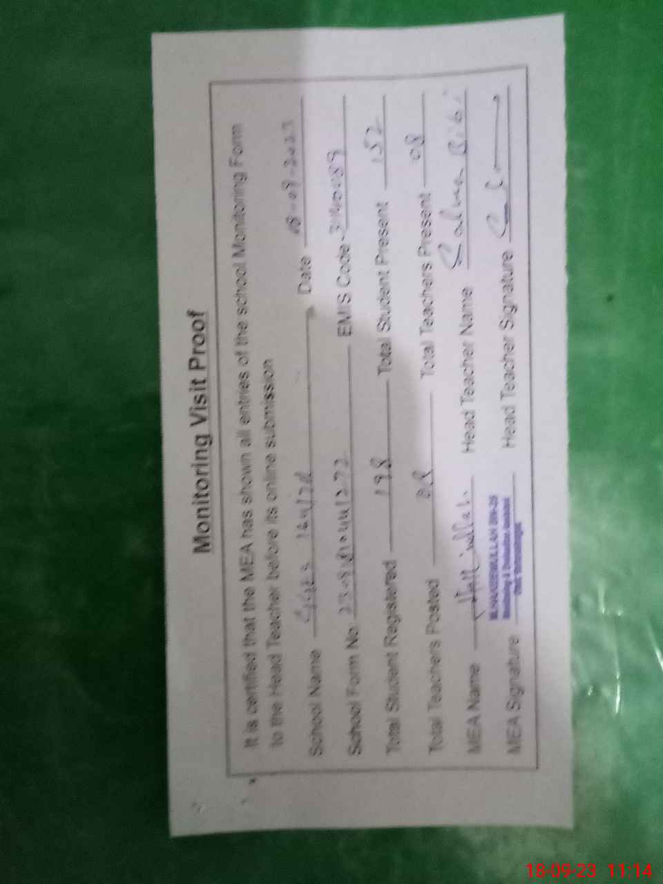| Attendance Register | Head Teacher | MEA with School | Visit Proof |