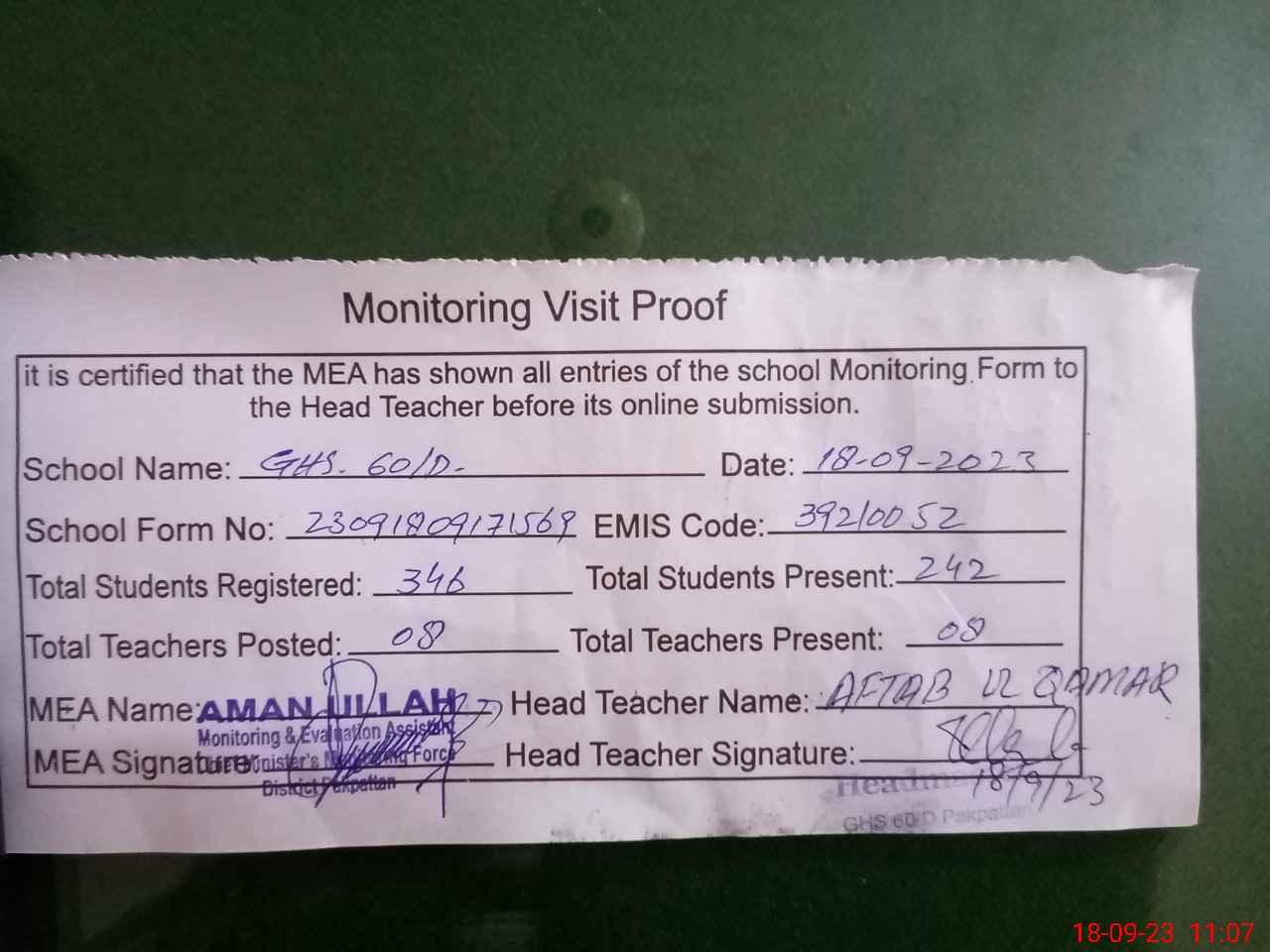 | Attendance Register | Head Teacher | MEA with School | Visit Proof |