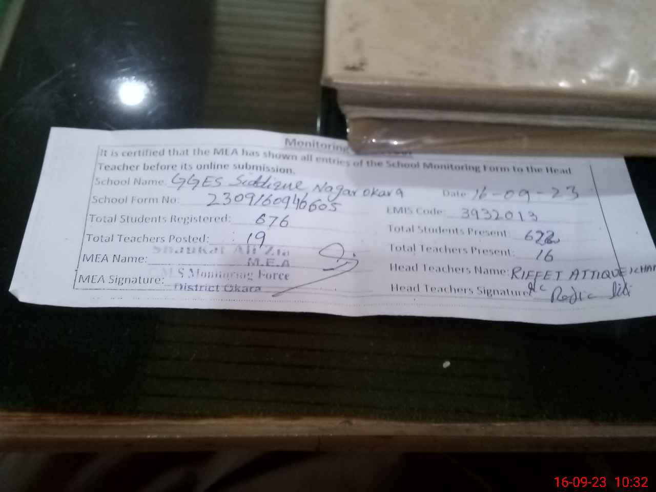 | Monitoring Date: 16-09-2023 | Start Time: 16-09-2023 09:46 AM | End Time: 16-09-2023 10:32 AM | Name of MEA: SH**** AL**** ZI**** (R**** | |