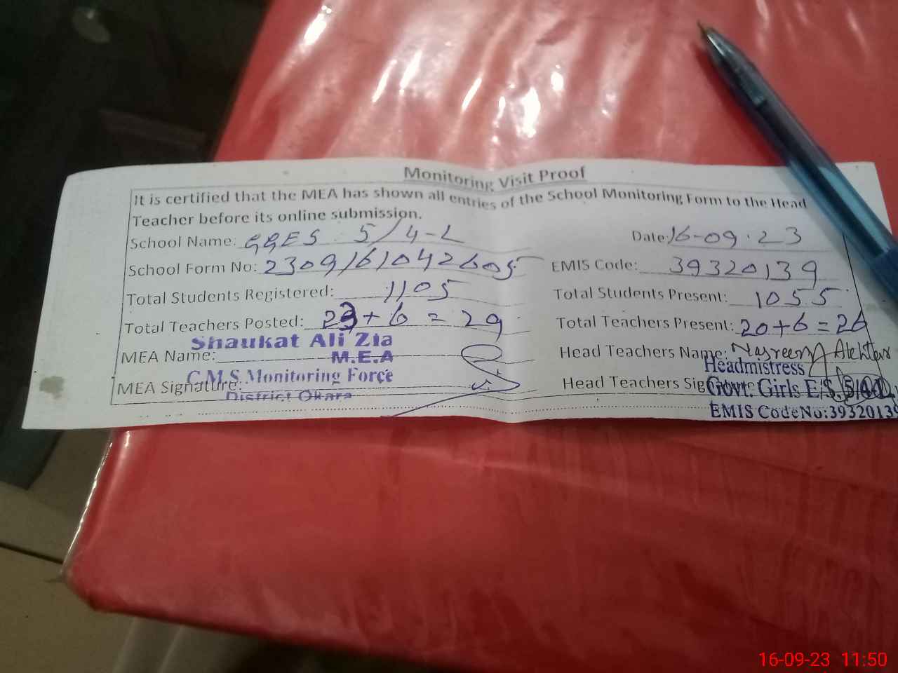 | Attendance Register | Head Teacher | MEA with School | Visit Proof |