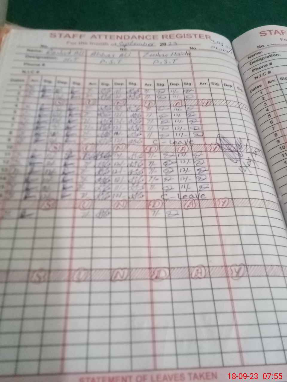 | CNIC | Full Name | Designation | R/C | Absence During Last Calender Month |