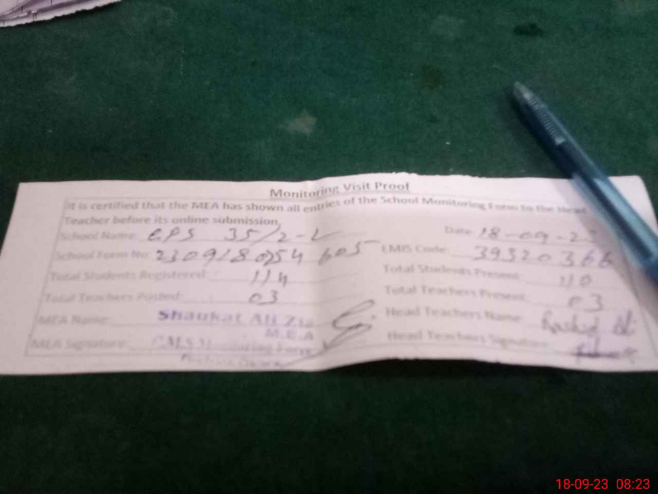 | Monitoring Date: 18-09-2023 | Start Time: 18-09-2023 07:54 AM | End Time: 18-09-2023 08:23 AM | Name of MEA: SH**** AL**** ZI**** (R**** | |