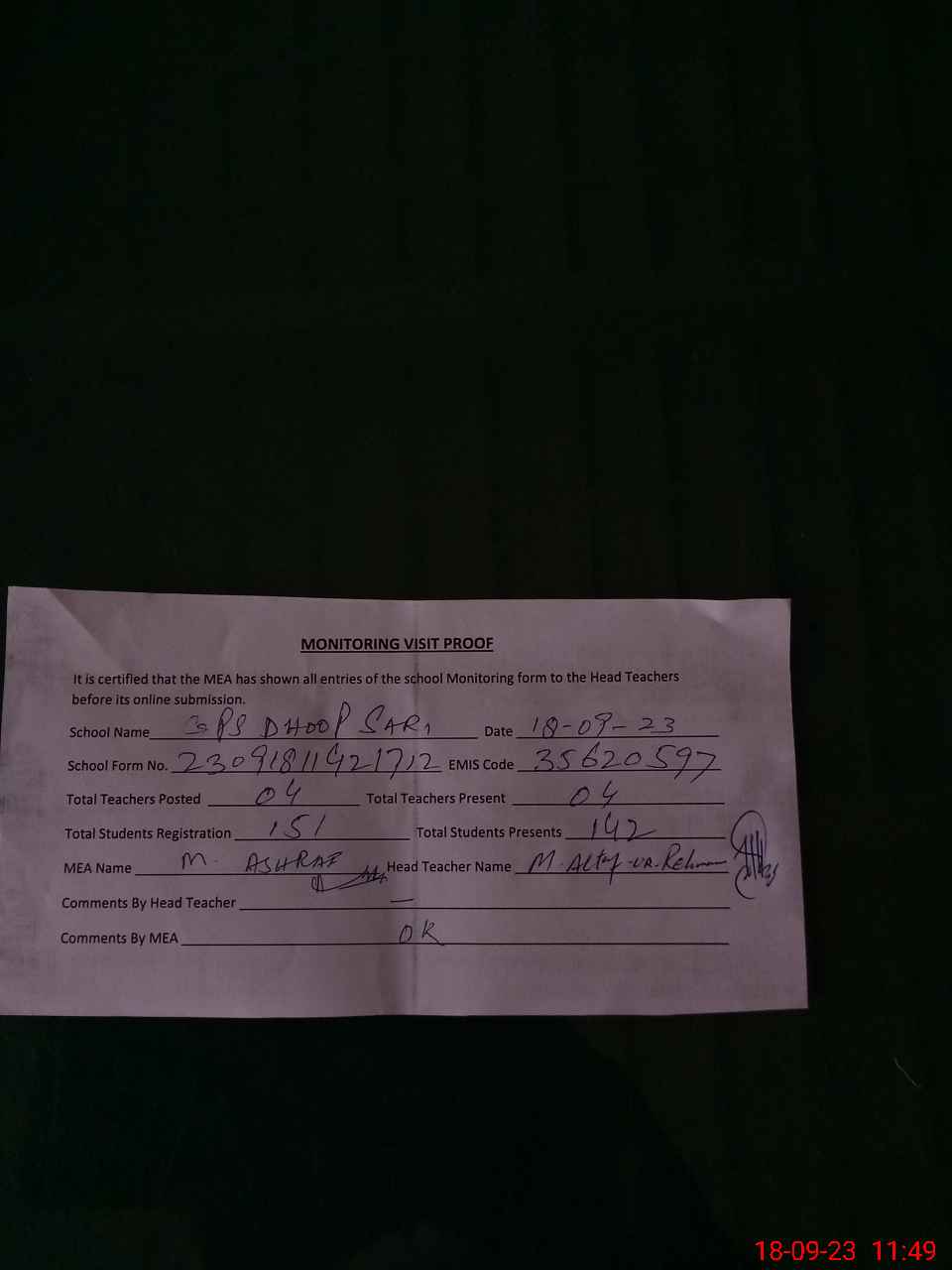 | EMIS Code: 35620597 | Name of School: GPS DHOOP SARI CHAK NO.78 | |||