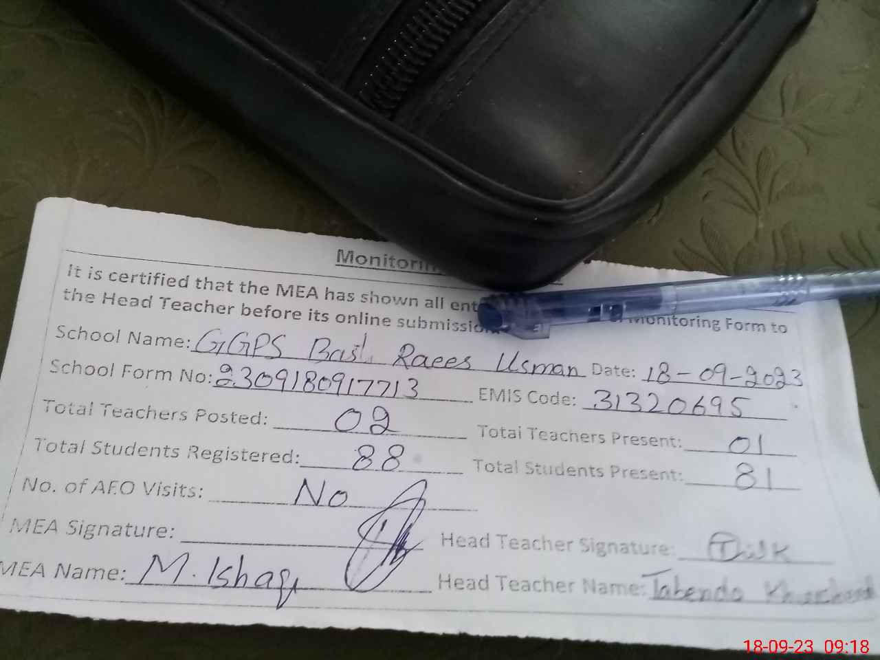 | Attendance Register | Head Teacher | MEA with School | Visit Proof |
