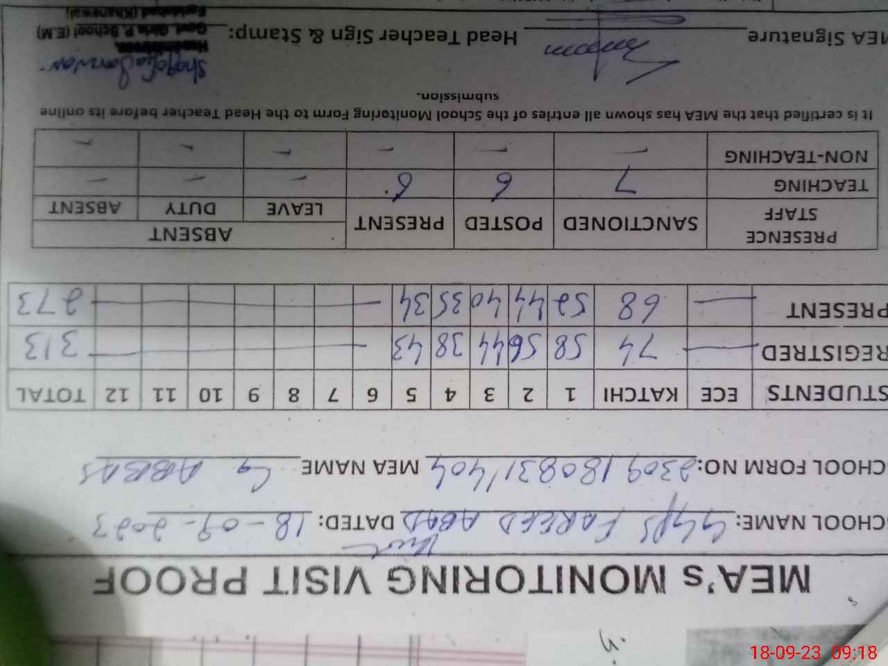 | Attendance Register | Head Teacher | MEA with School | Visit Proof |