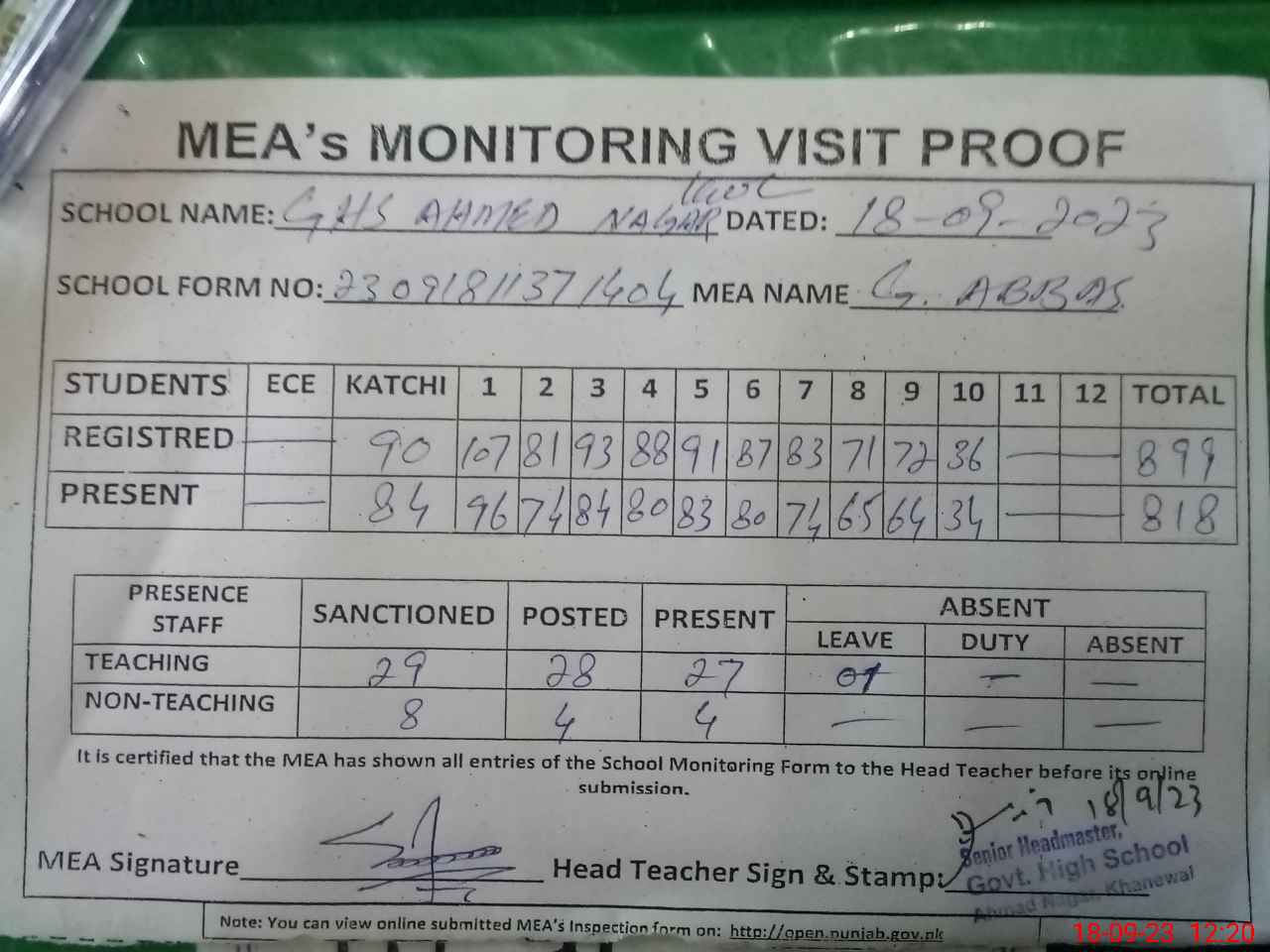 | Attendance Register | Head Teacher | MEA with School | Visit Proof |