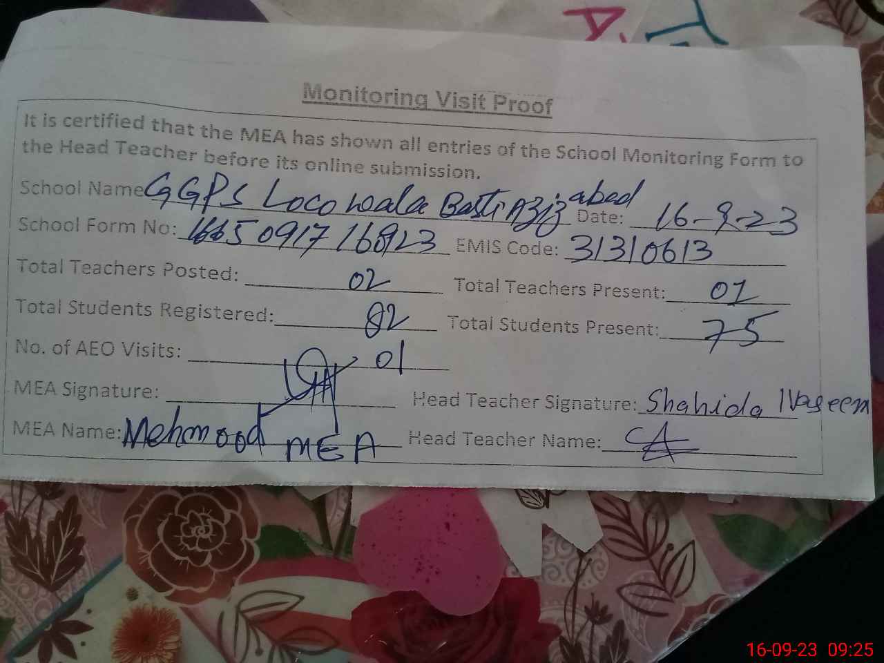 | EMIS Code: 31310613 | Name of School: GGPS LOCO WALA BASTI AZIZ ABAD | |||
