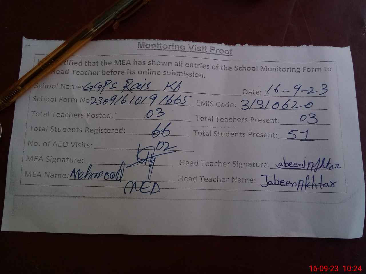| Attendance Register | Head Teacher | MEA with School | Visit Proof |
