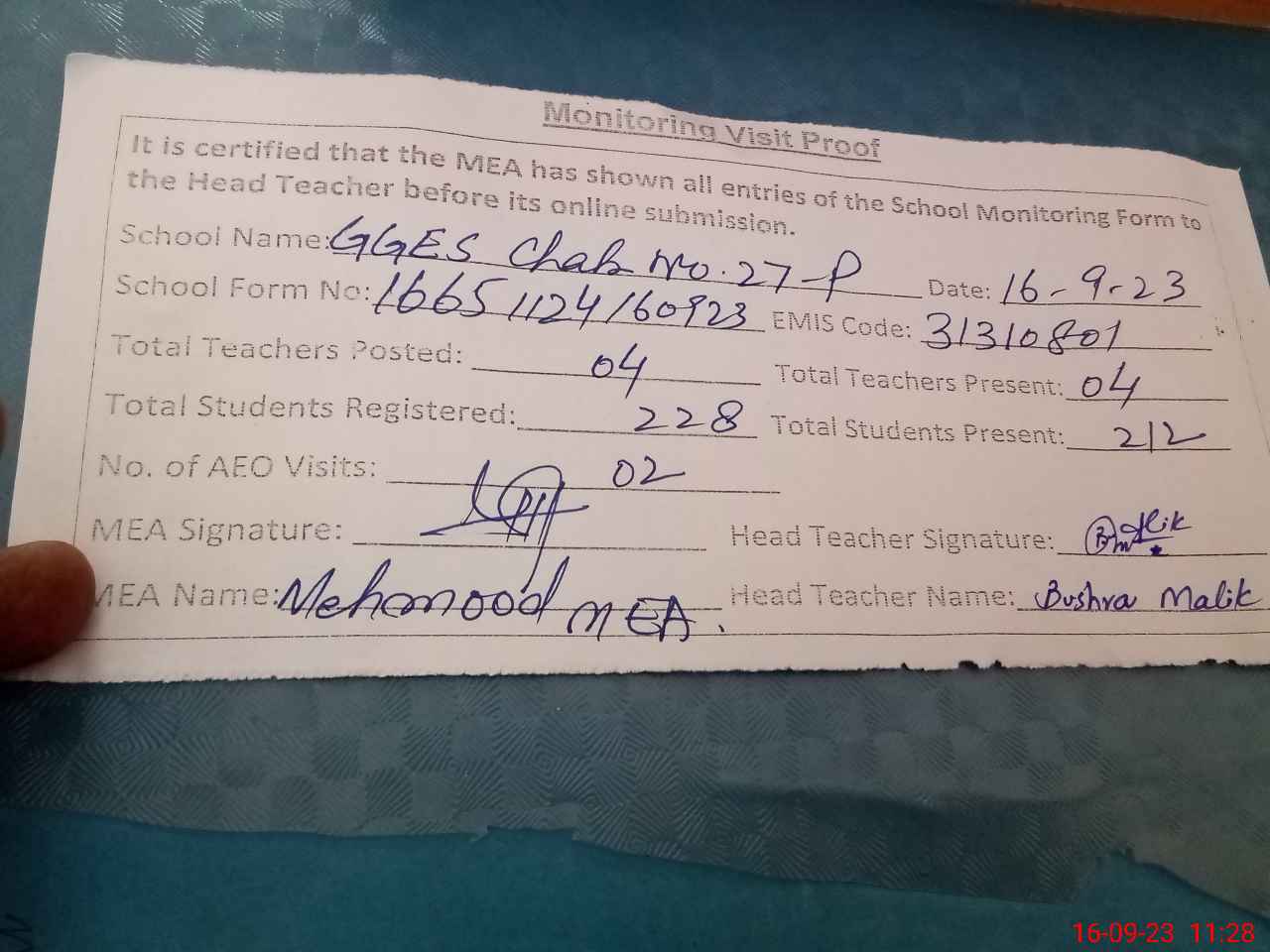 | Attendance Register | Head Teacher | MEA with School | Visit Proof |