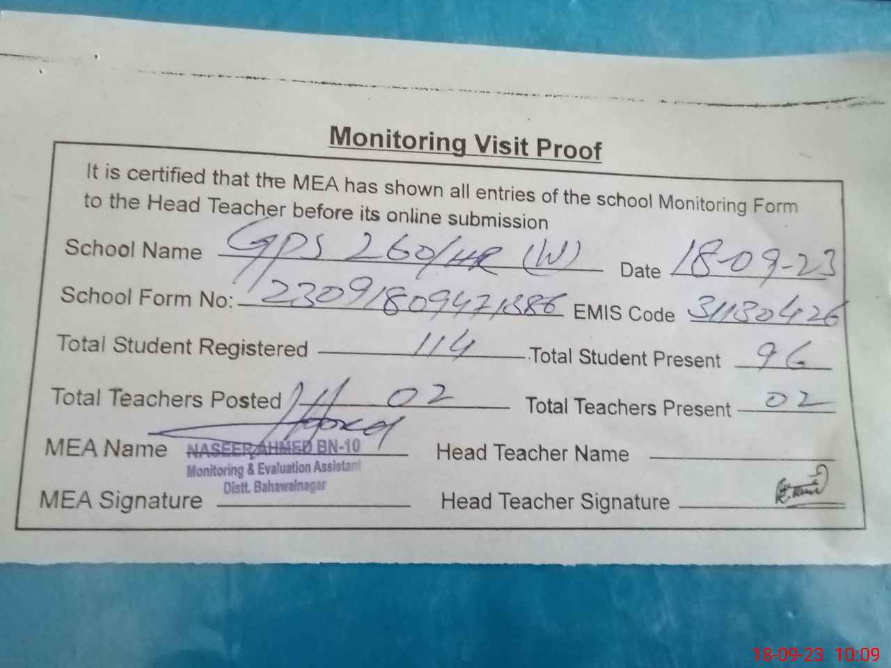 | EMIS Code: 31130426 | Name of School: GPS CHAK NO.260/HR WEST | |||