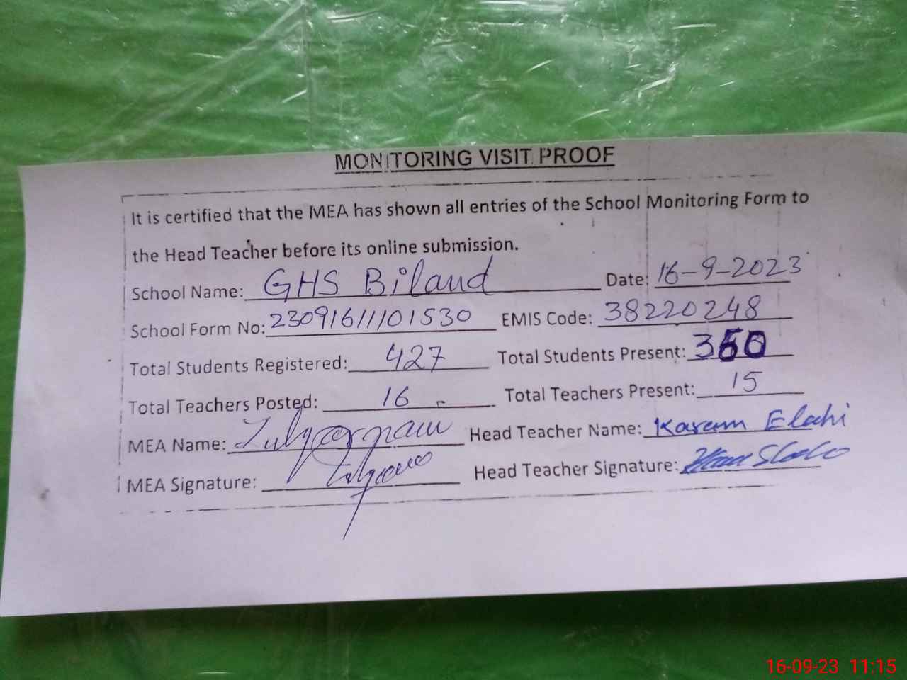 | Attendance Register | Head Teacher | MEA with School | Visit Proof |