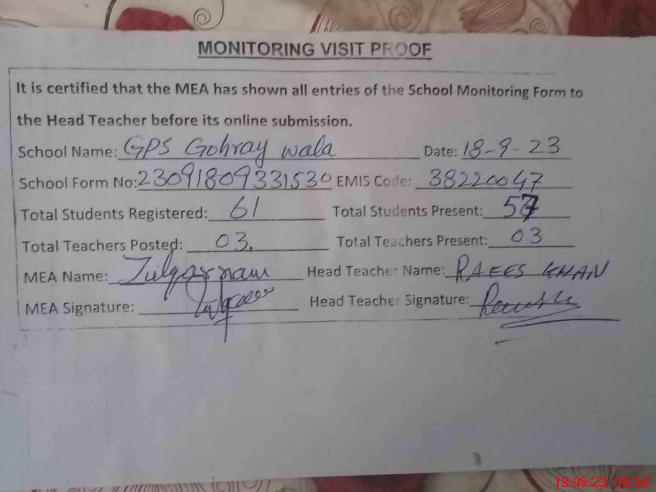 | Attendance Register | Head Teacher | MEA with School | Visit Proof |