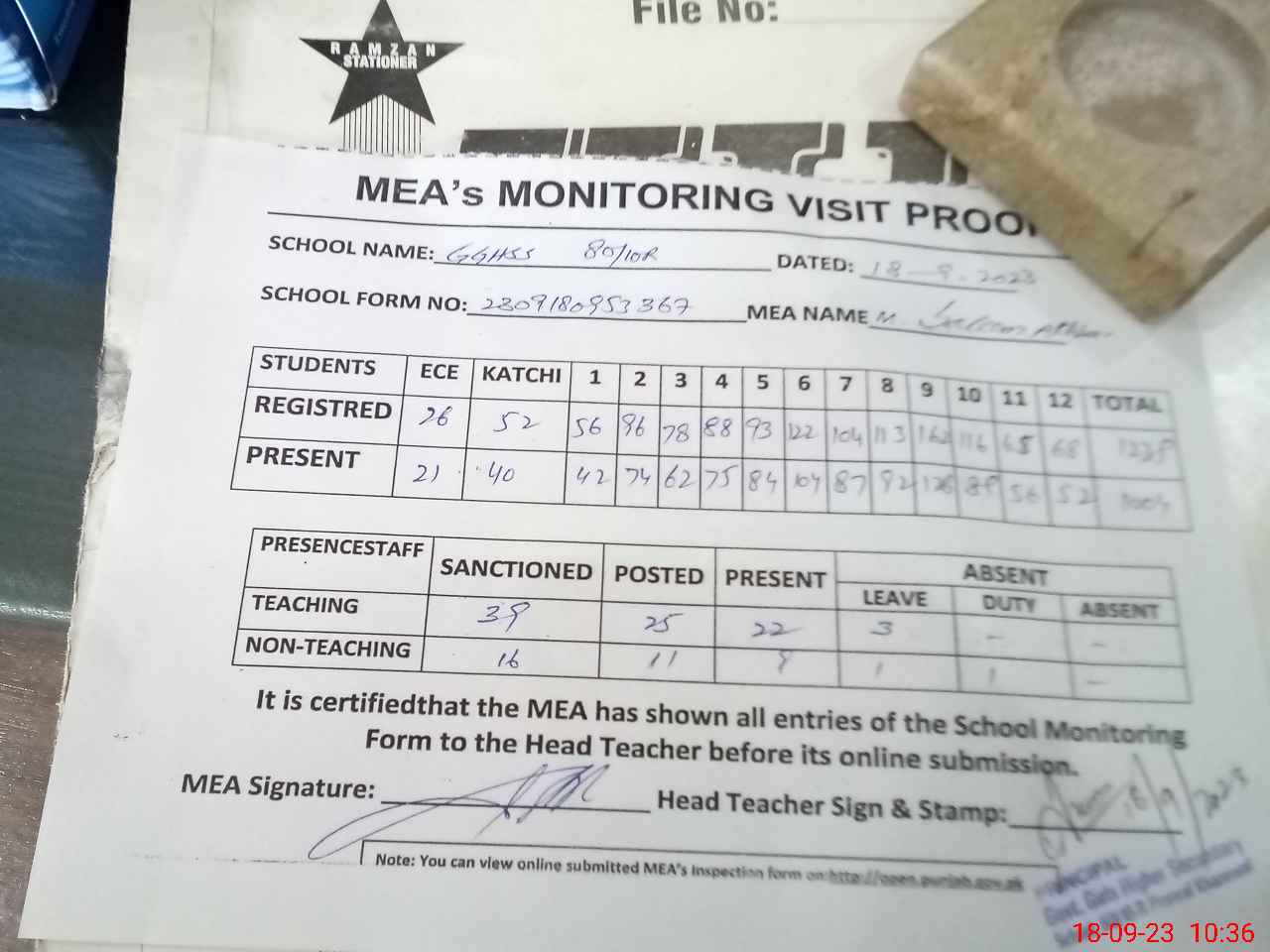 | Attendance Register | Head Teacher | MEA with School | Visit Proof |