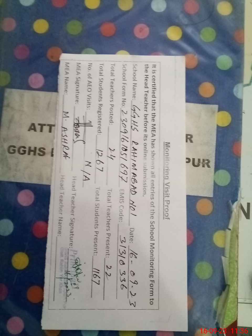 | Attendance Register | Head Teacher | MEA with School | Visit Proof |