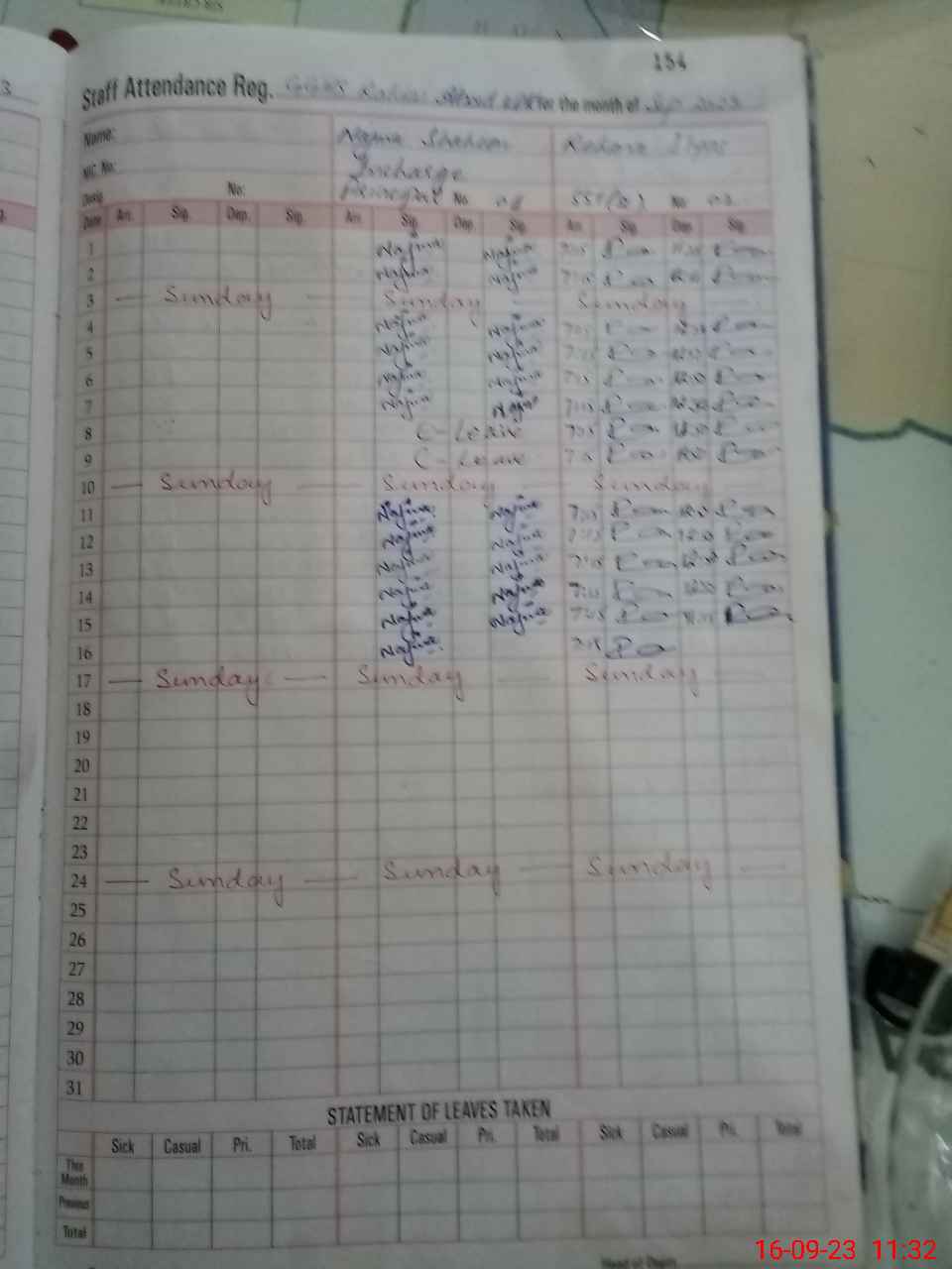 | CNIC | Full Name | Designation | R/C | Absence During Last Calender Month |