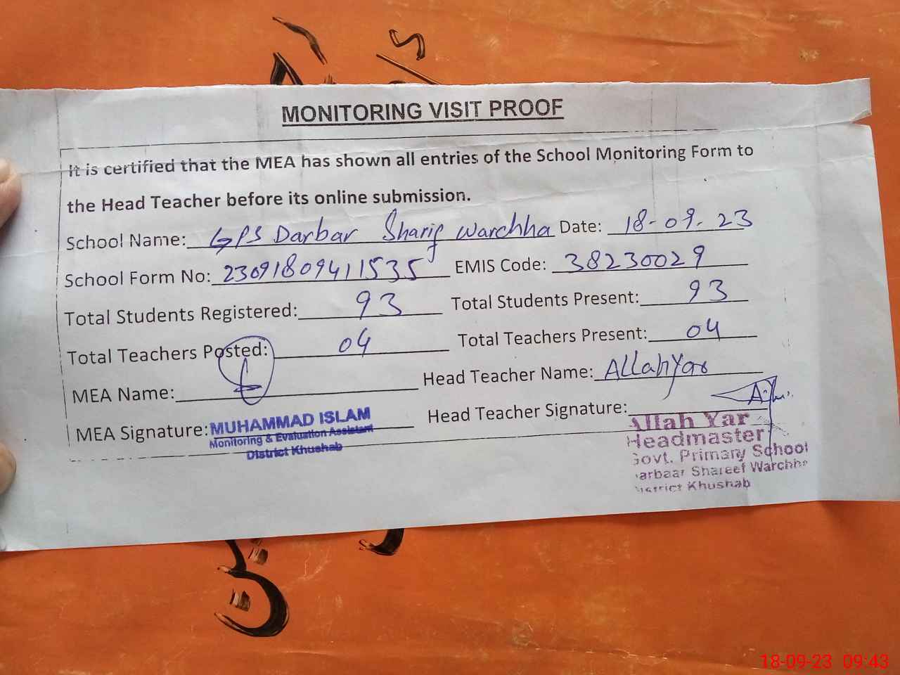 | EMIS Code: 38230029 | Name of School: GPS DARBAR SHARIF WARCHHA | |||