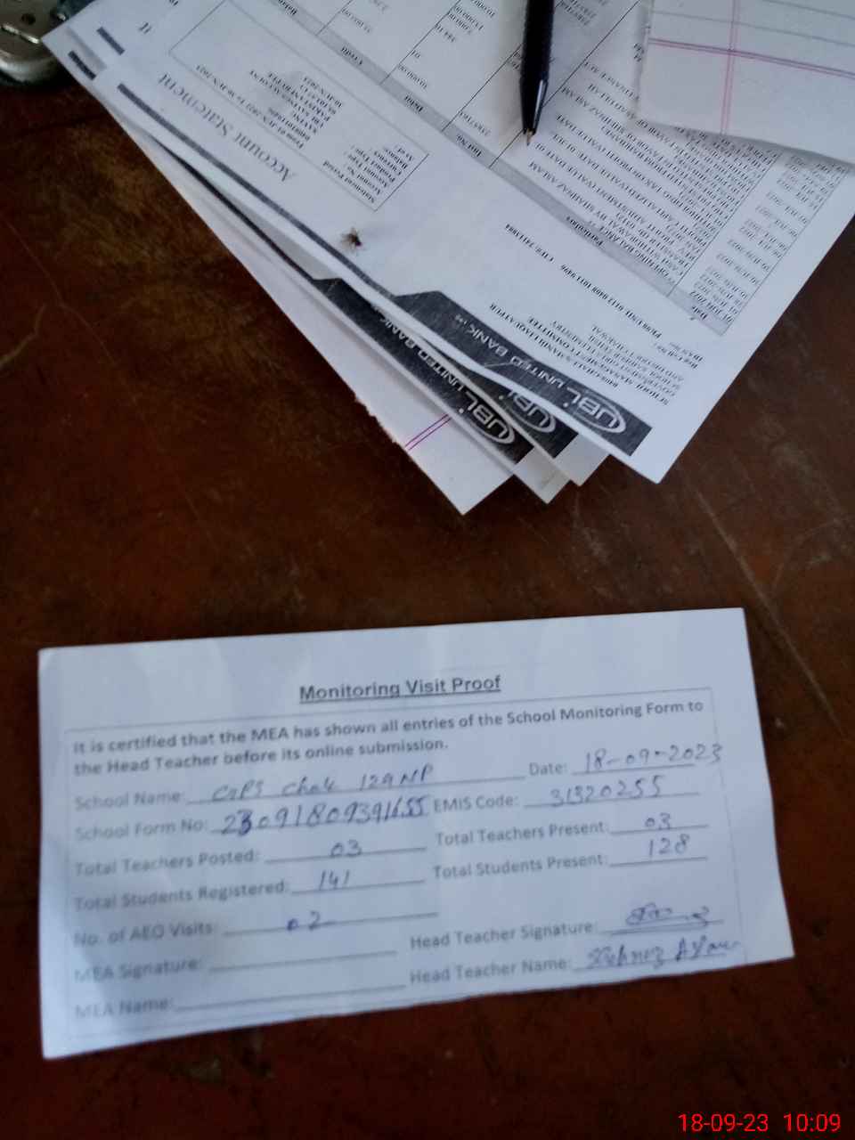 | Attendance Register | Head Teacher | MEA with School | Visit Proof |