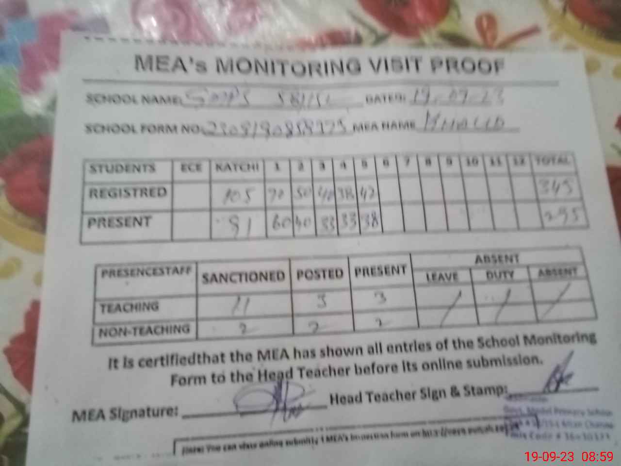 | Certified that this School was Inspected by the Undersigned MEA/DMO Today and the Information Stated Above is as Per Record. | |||||
