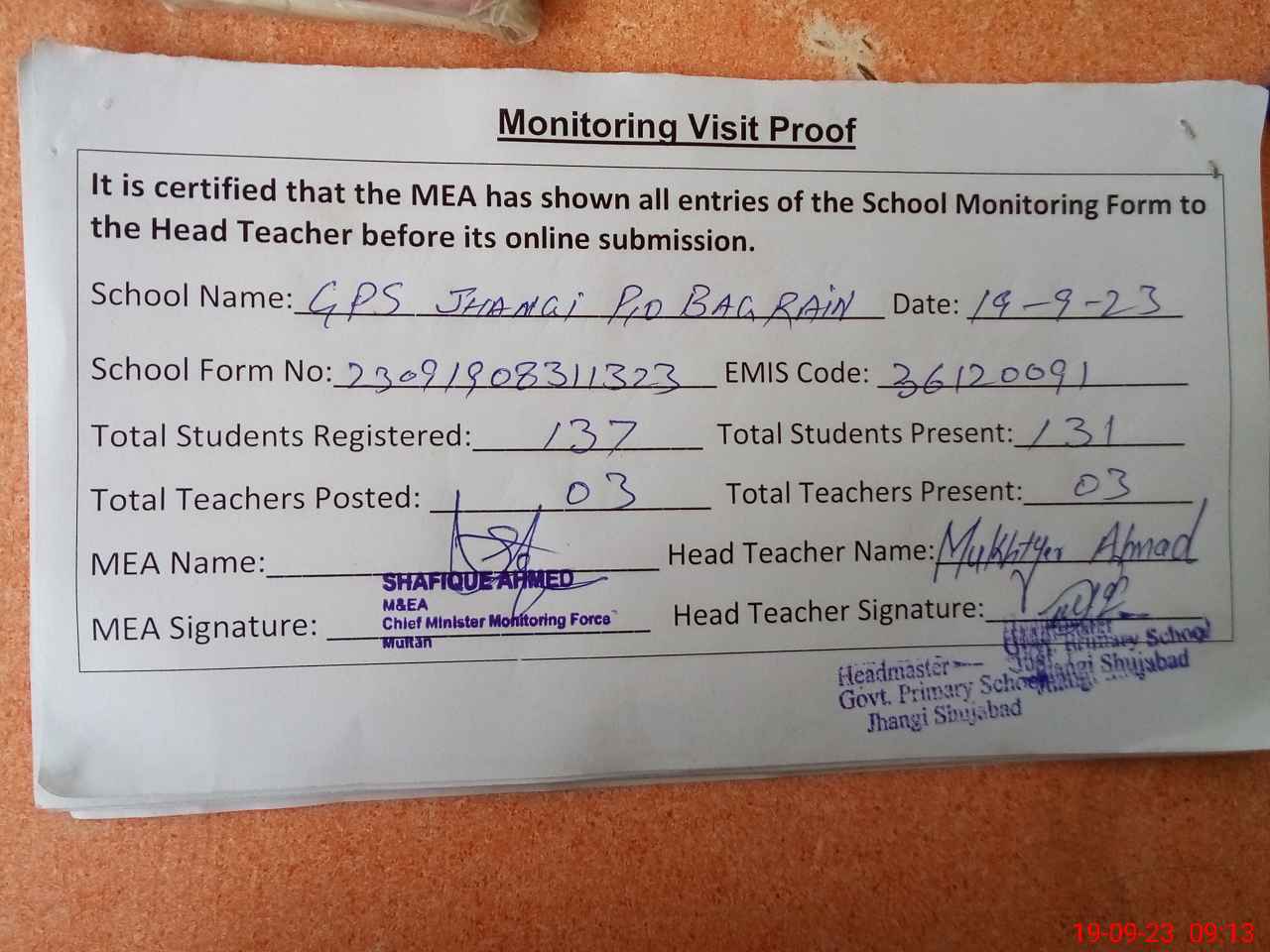 | Attendance Register | Head Teacher | MEA with School | Visit Proof |