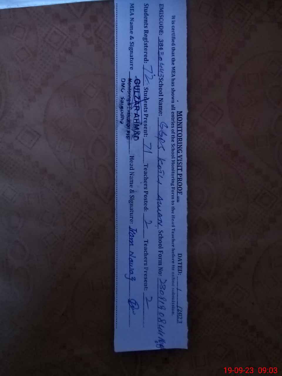 | Certified that this School was Inspected by the Undersigned MEA/DMO Today and the Information Stated Above is as Per Record. | |||||