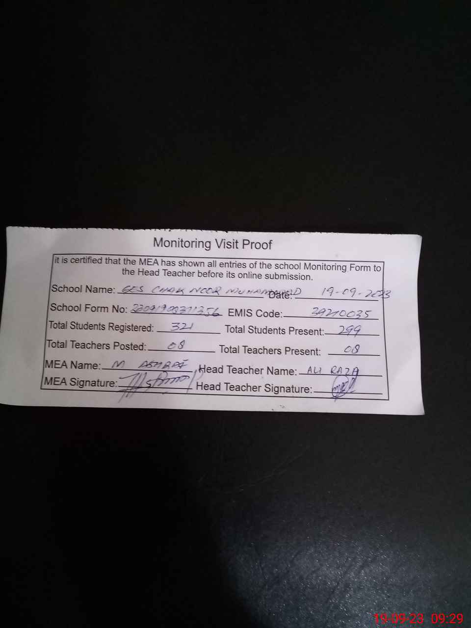 | Attendance Register | Head Teacher | MEA with School | Visit Proof |