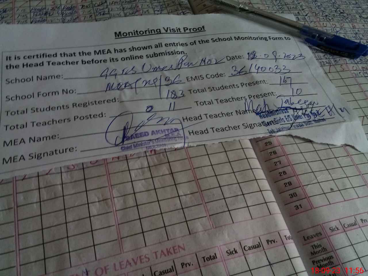 | Attendance Register | Head Teacher | MEA with School | Visit Proof |