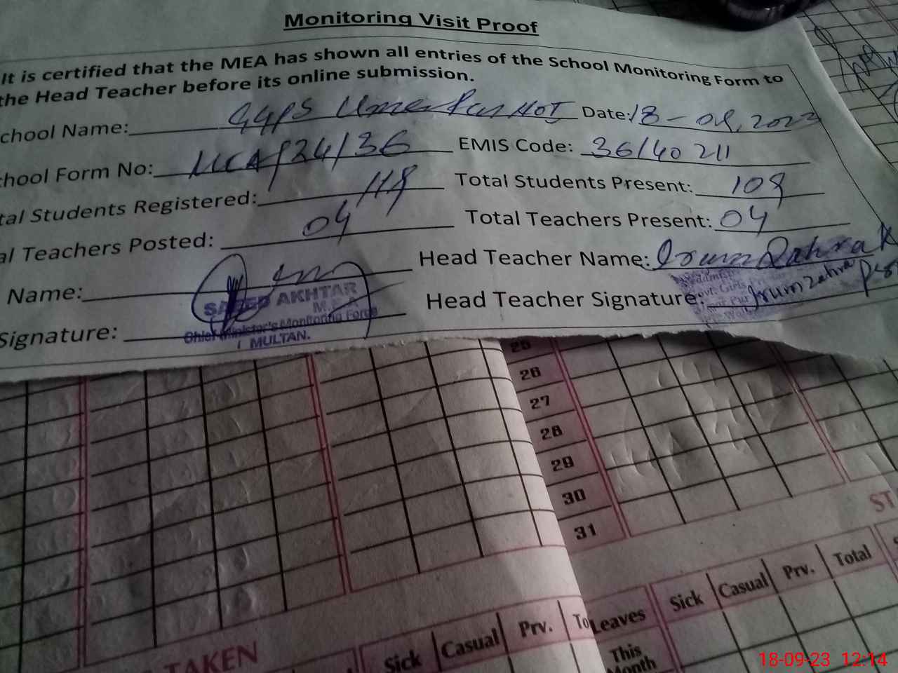 | Attendance Register | Head Teacher | MEA with School | Visit Proof |