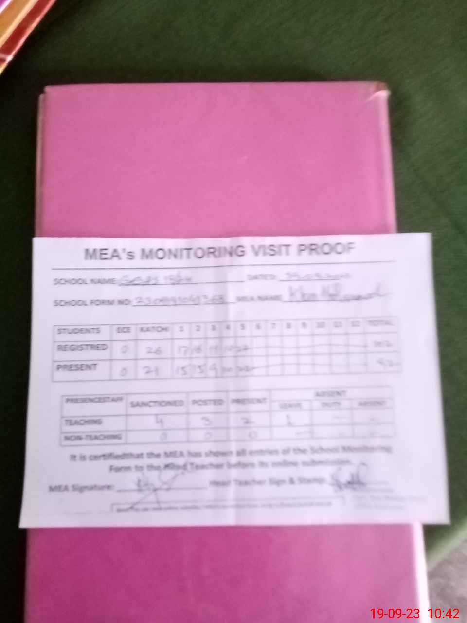 | Attendance Register | Head Teacher | MEA with School | Visit Proof |