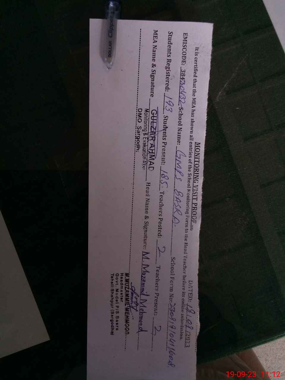 | Certified that this School was Inspected by the Undersigned MEA/DMO Today and the Information Stated Above is as Per Record. | |||||