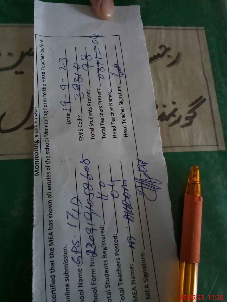 | Attendance Register | Head Teacher | MEA with School | Visit Proof |