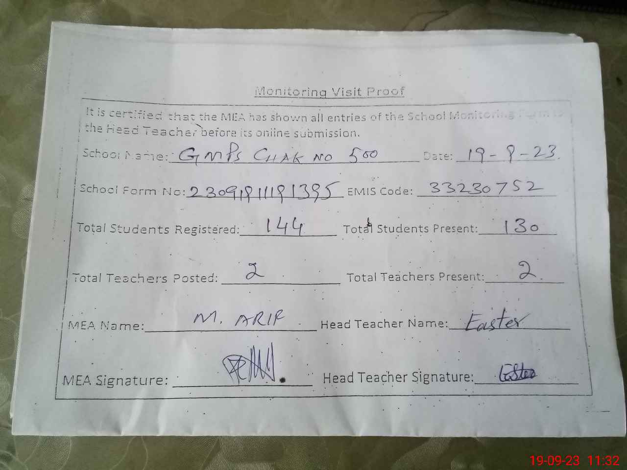 | Attendance Register | Head Teacher | MEA with School | Visit Proof |