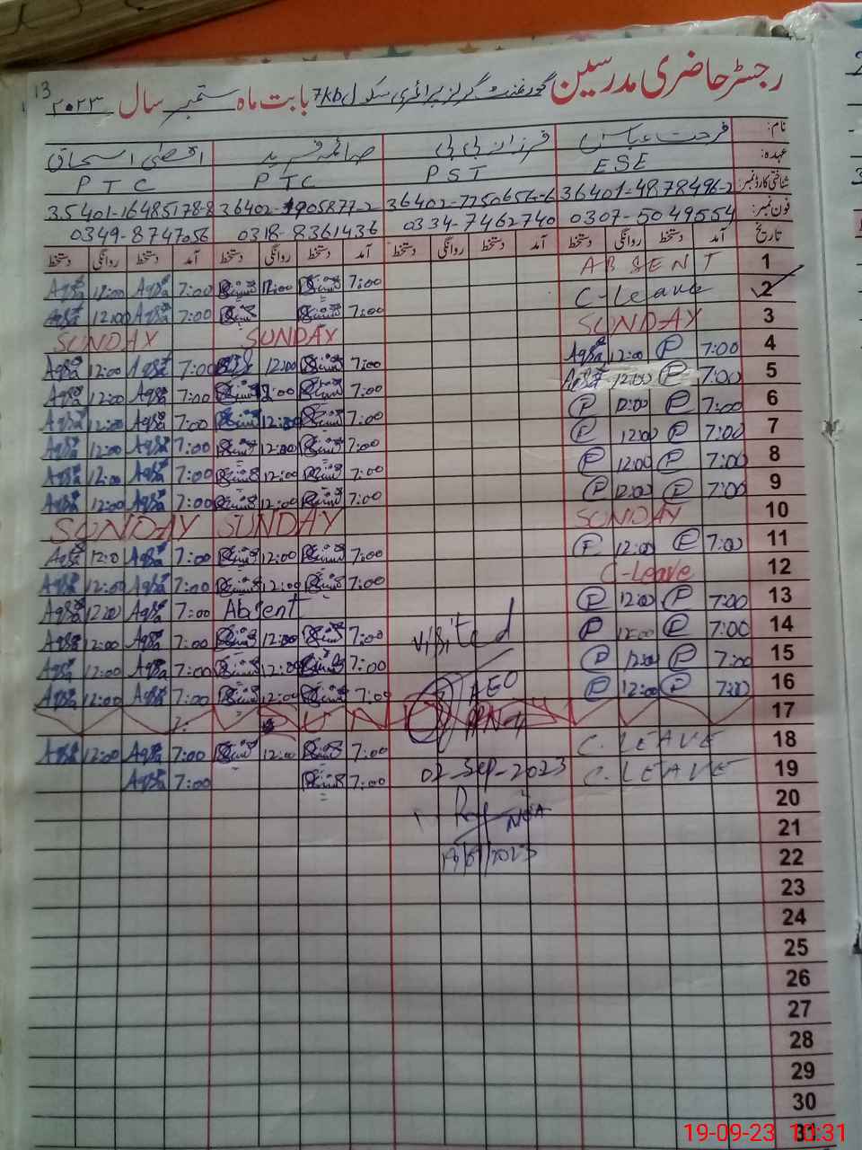 | CNIC | Full Name | Designation | R/C | Absence During Last Calender Month |