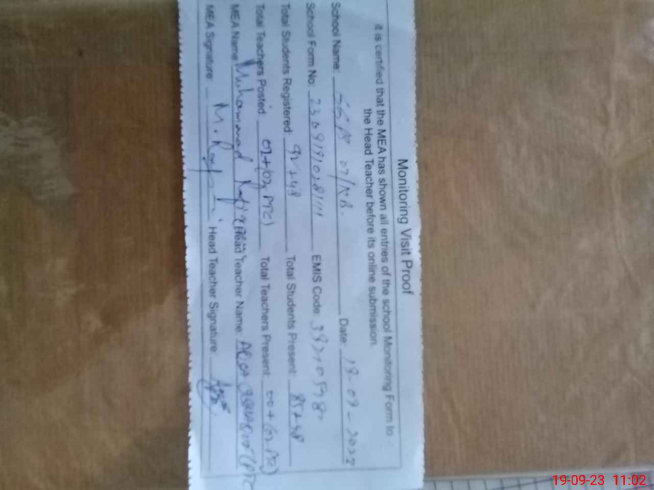 | Attendance Register | Head Teacher | MEA with School | Visit Proof |