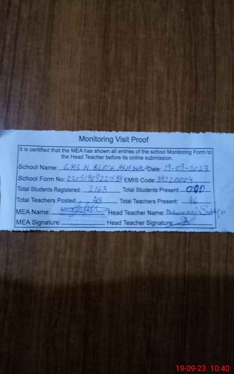 | EMIS Code: 39220004 | Name of School: GHS ARIFWALA N BLOCK | |||