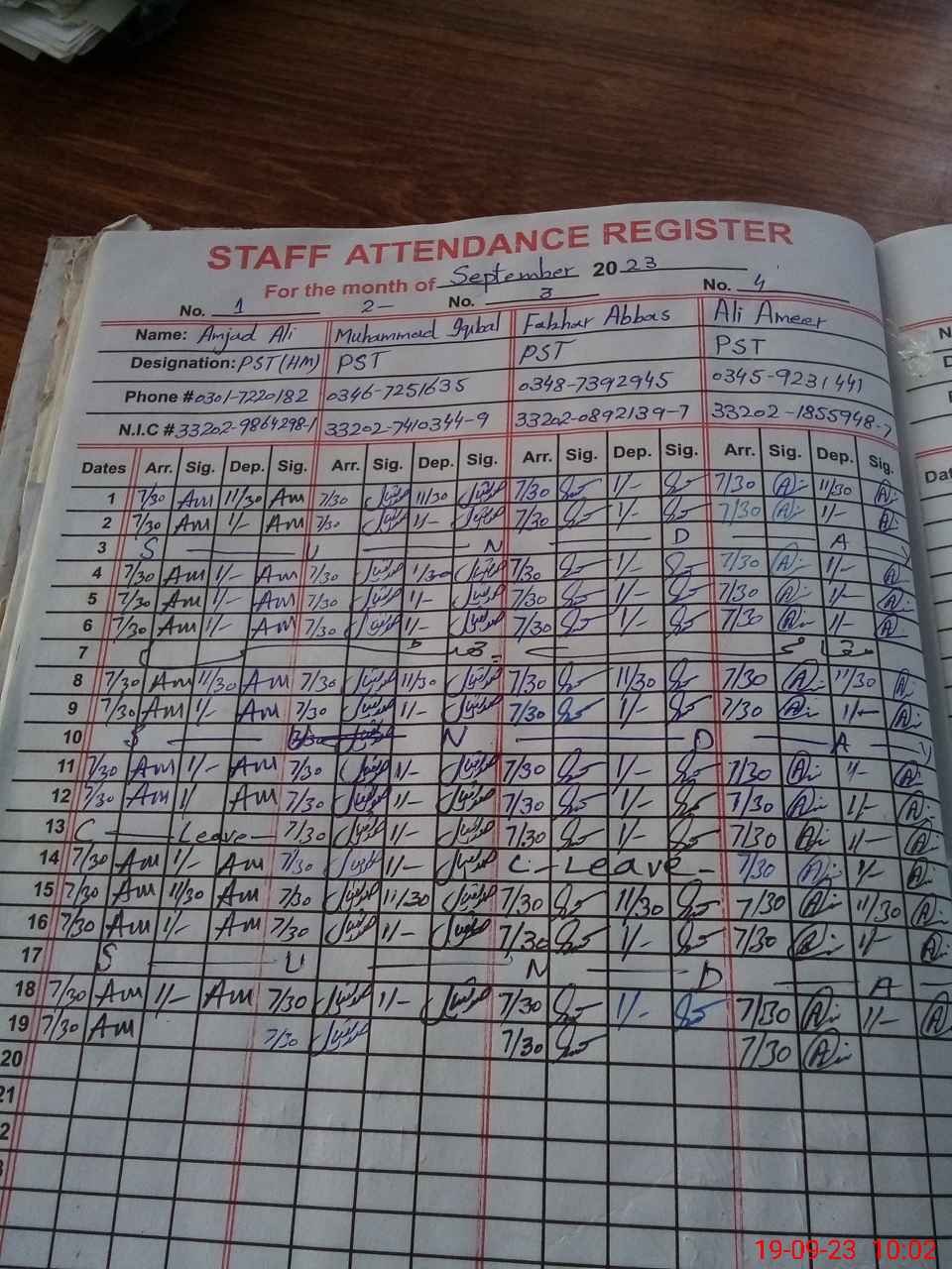 | CNIC | Full Name | Designation | R/C | Absence during last cal. month |