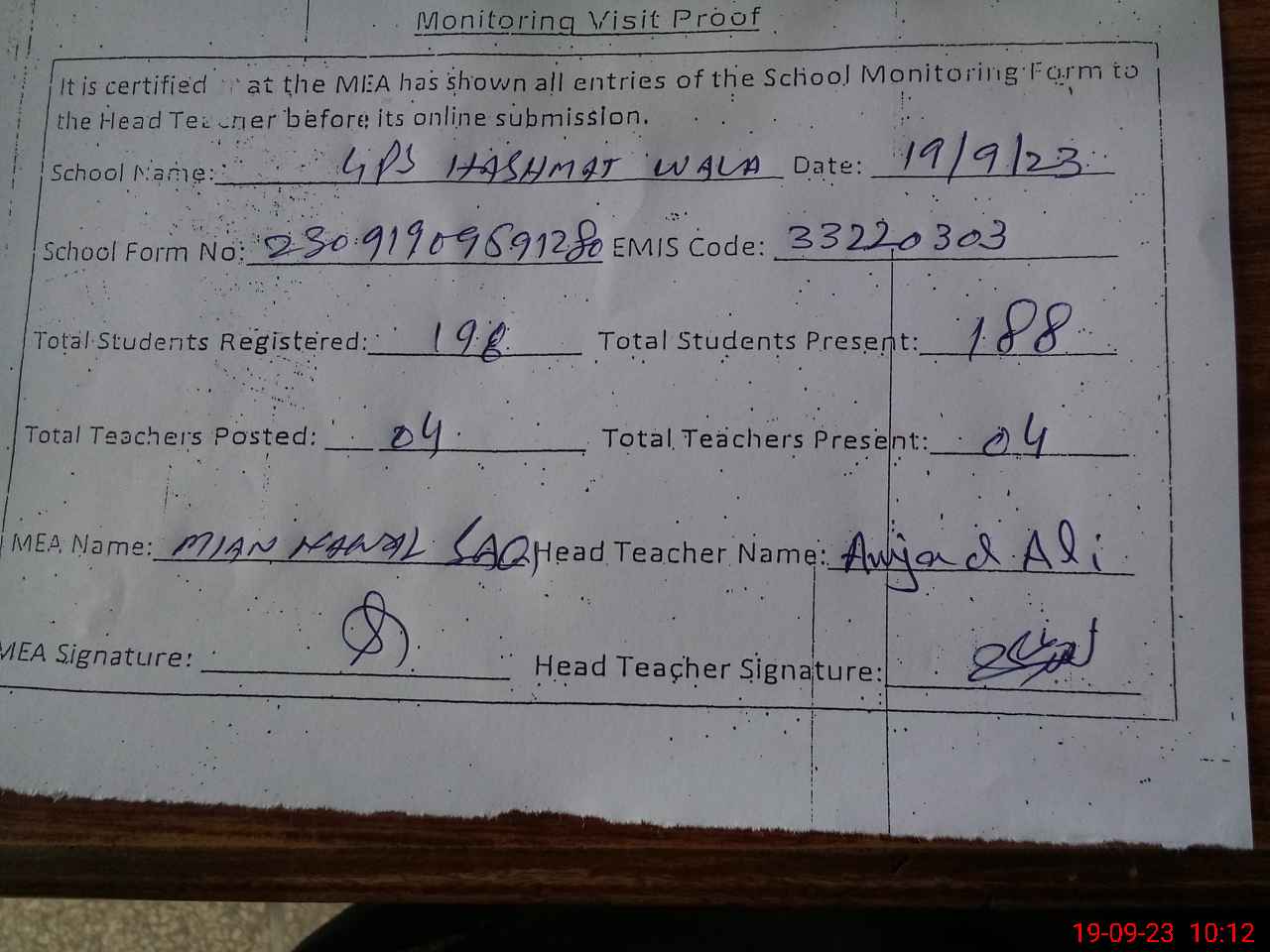 | Attendance Register | Head Teacher | MEA with School | Visit Proof |
