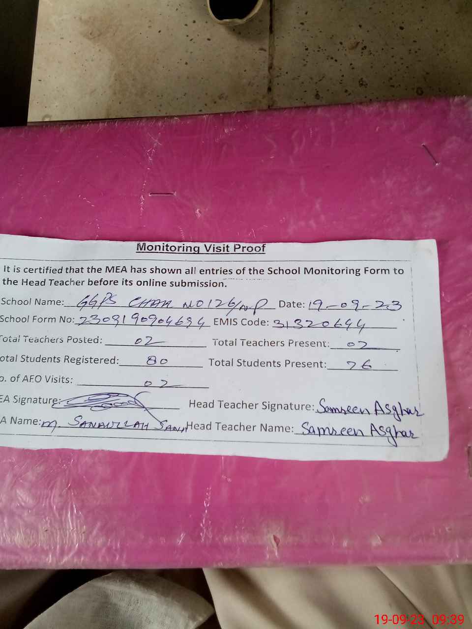 | Attendance Register | Head Teacher | MEA with School | Visit Proof |