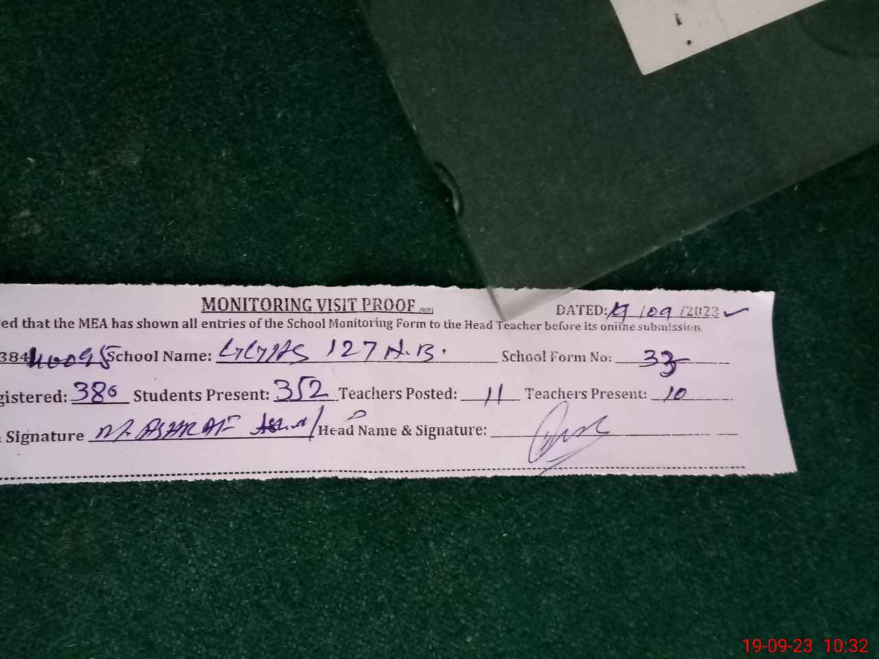 | Attendance Register | Head Teacher | MEA with School | Visit Proof |