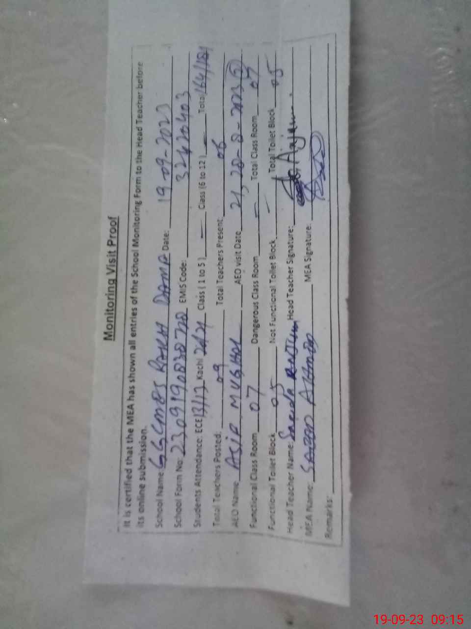 | Monitoring Date: 19-09-2023 | Start Time: 19-09-2023 08:35 AM | End Time: 19-09-2023 09:20 AM | Name of MEA: Sa**** Ah**** | |