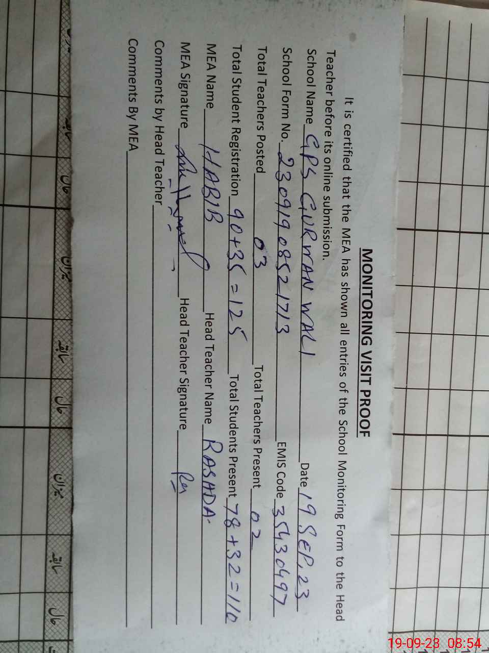 | Attendance Register | Head Teacher | MEA with School | Visit Proof |