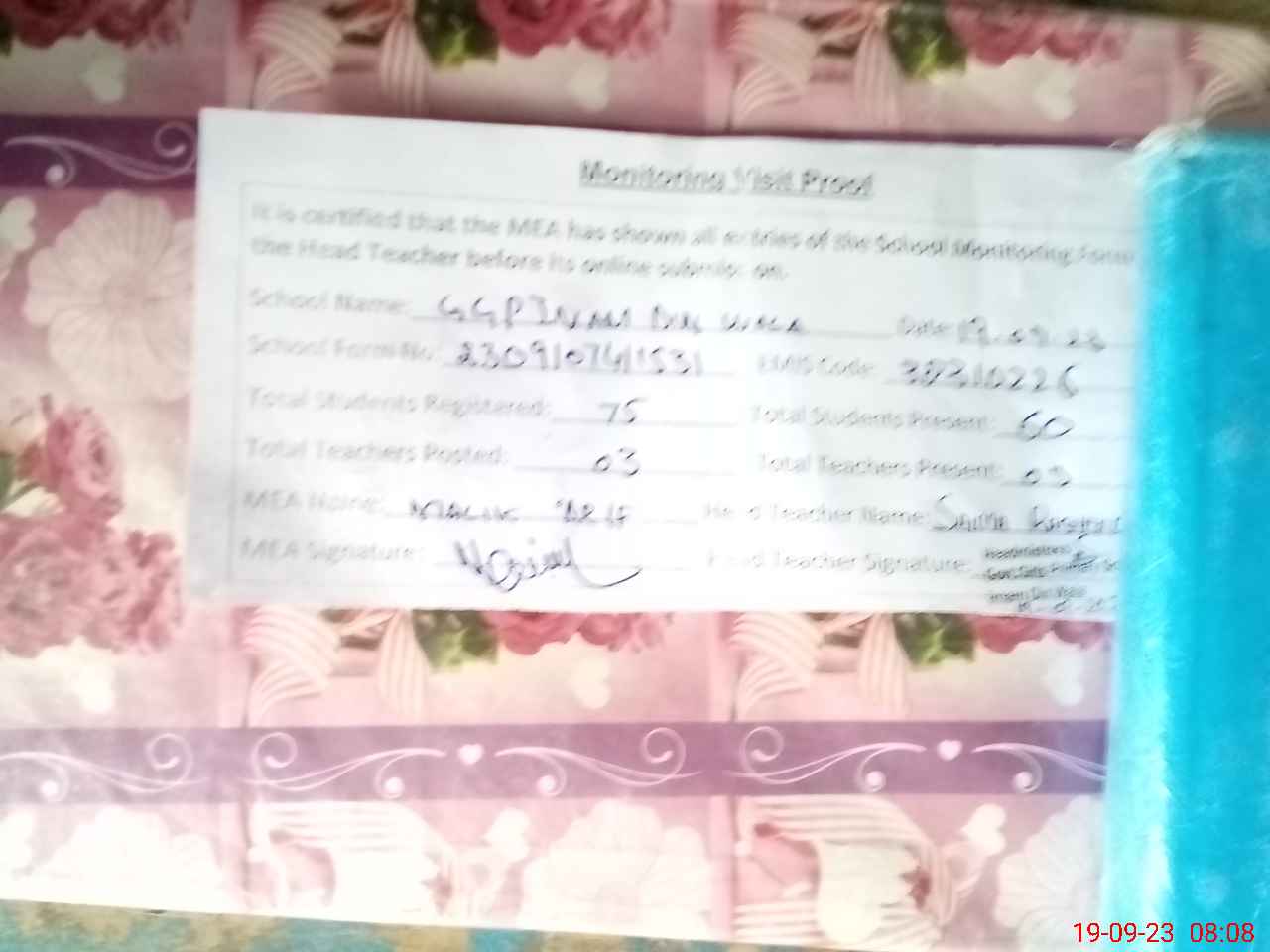 | Total no. of Classrooms: 3 No. of Classrooms Used for Teaching: 3 No. of Classrooms Storing Old Furniture, FTBs, etc: 0Comments if Any: School council committee meeting register not maintained Boundary wall is partially functional as not built all around the school |