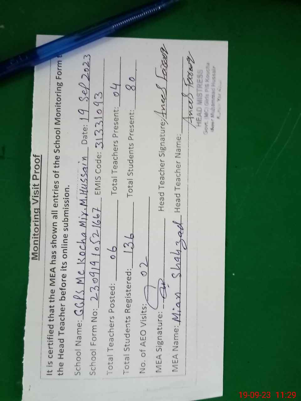 | EMIS Code: 31331093 | Name of School: GGPS MC KOCHA MIR MUHAMMAD HUSSAIN | |||